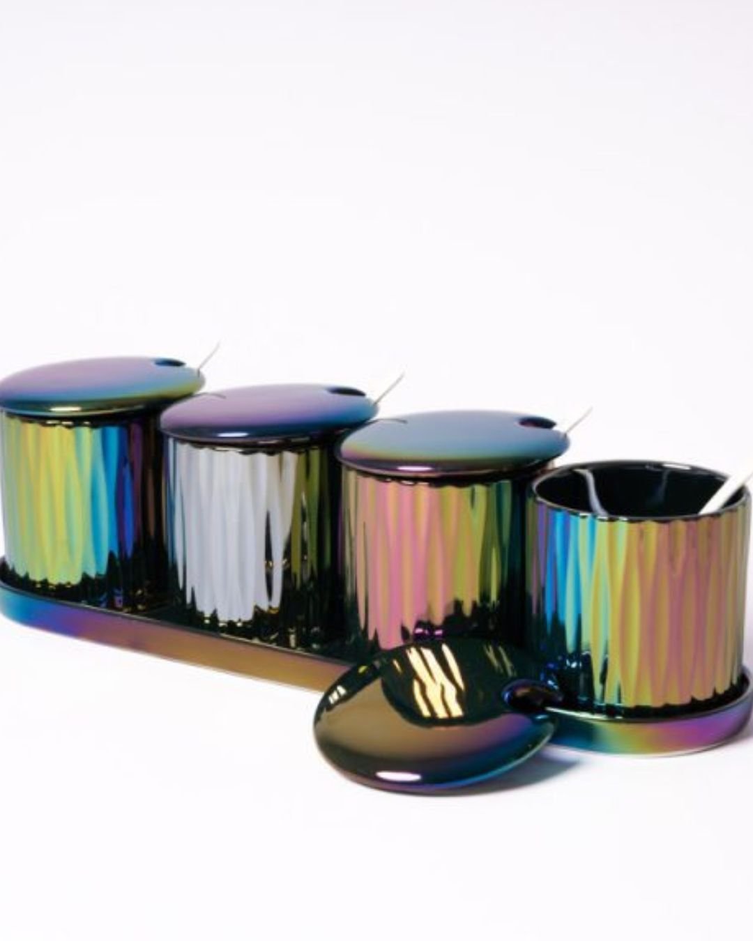 Eleganță în Bucătărie – Set 4 Recipiente Ceramice Mov Holografic cu Tăviță